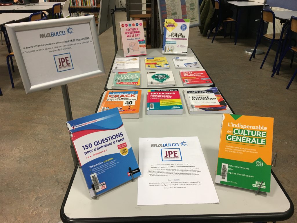 Boostez votre entrée dans la vie professionnelle : notre sélection pour la Journée Premier Emploi A l’occasion de la Journée du Premier Emploi, venez découvrir notre sélection d’ouvrages Orientation à la BU de Calais. Pour une première approche, jetez un coup d’œil à la: Bibliographie Agathe Bacquet 24 novembre 202524 novembre 2025 Actu' BU, Non classé, Sciences et Techniques, Sciences et technologies
